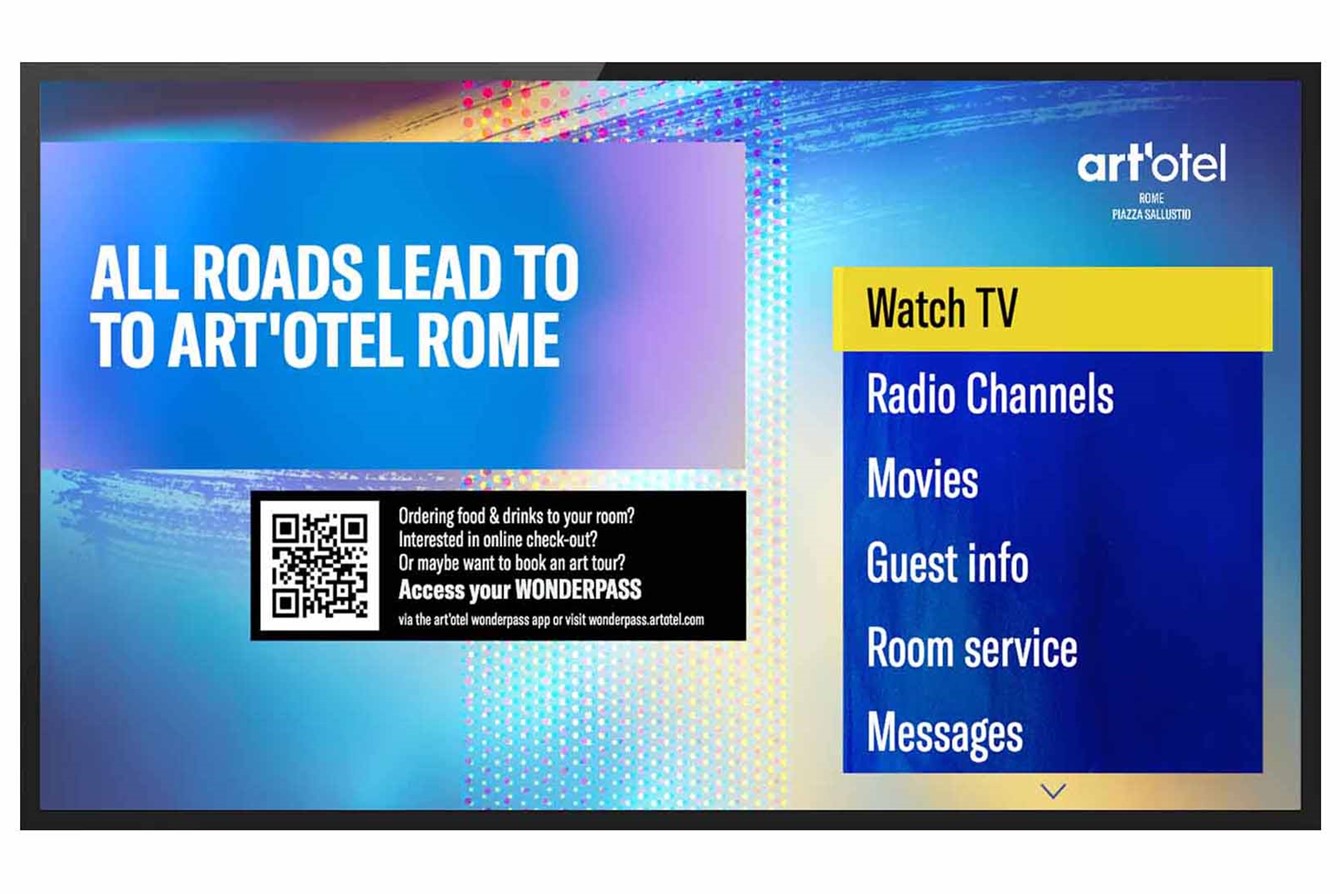 Airwave’s design technicians worked closely with art’otel to refine and reskin the brand’s standard TV interface, retaining the key design elements but introducing a new eye-popping colour palette that stands up to the artwork on the walls—we're talking electric blue with mustard yellow undertones and a splash of purple and pink (it’s like the TV is part of the exhibit).
