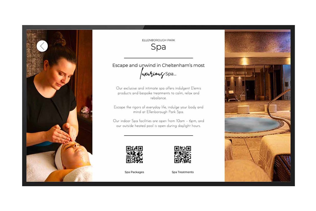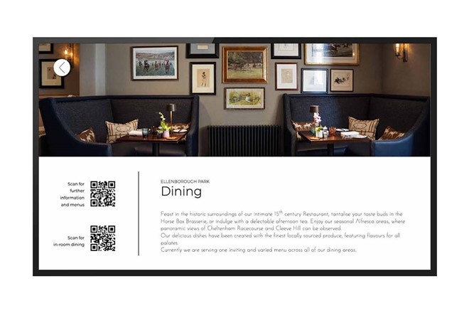 Airwave designed a series of pages, augmenting the information contained within, with QR code functionality - enabling a guest to point and click at the on-screen codes, to access the hotel's website. This is particularly useful for features such as spa treatment bookings and room service - offering value-added convenience for the guest, and additional revenue opportunities for the hotel.