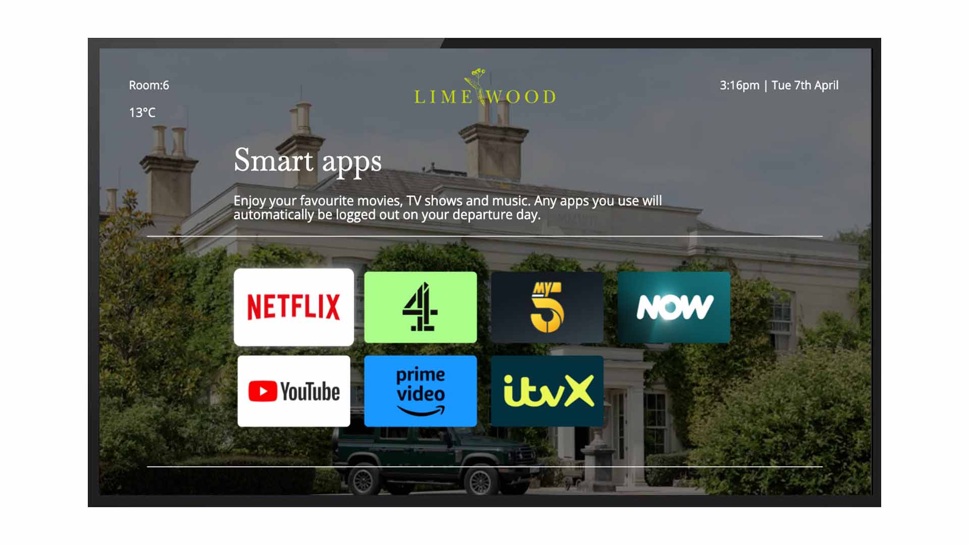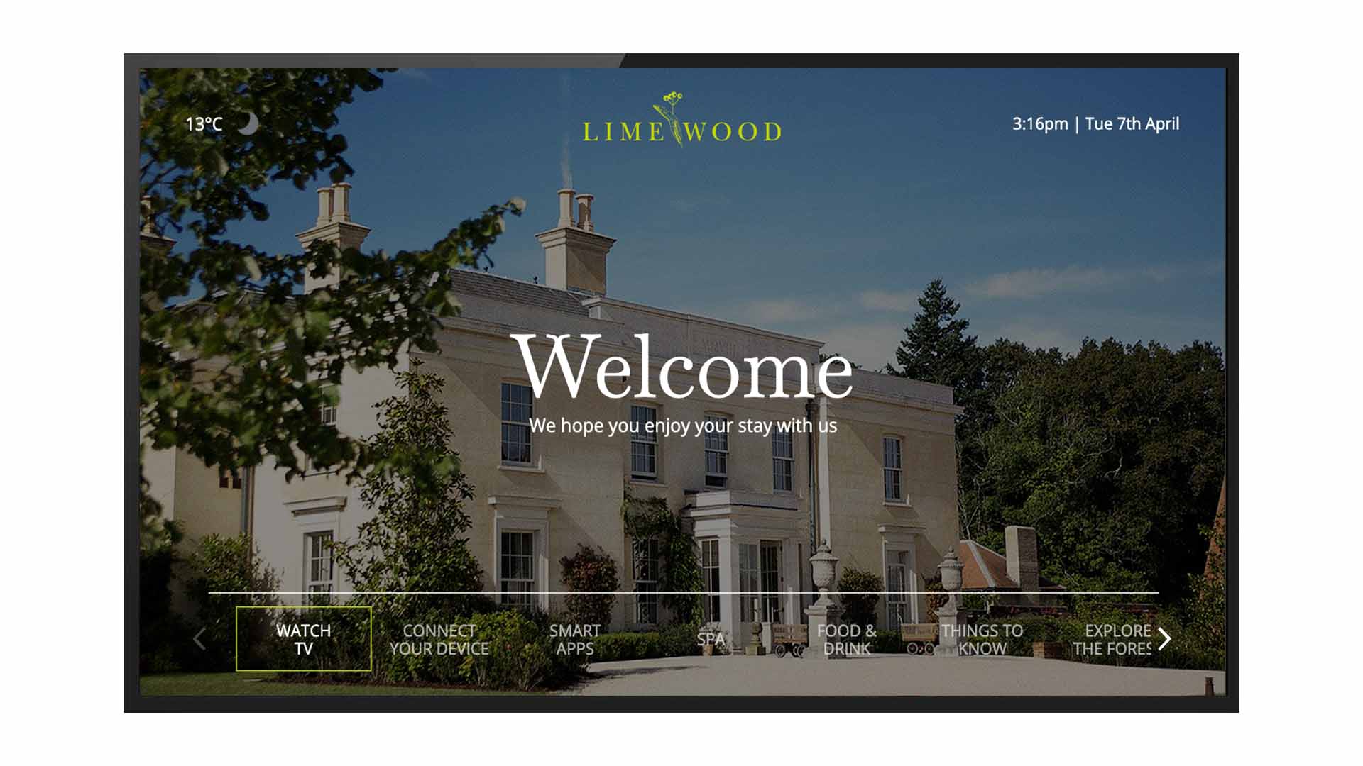 Lime Wood required a complete, end-to-end in-room entertainment system. This encompassed new televisions, a centralised content management platform, a casting solution, full TV reception and signal distribution infrastructure, Sky Select headend commissioning, and integration with the hotel's Property Management System.
