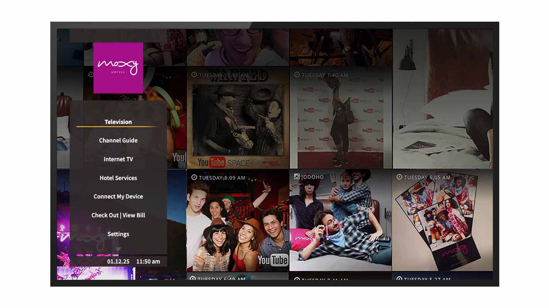 • A Uniguest guest room entertainment platform with branded UI, hotel information, and centralised content management.
